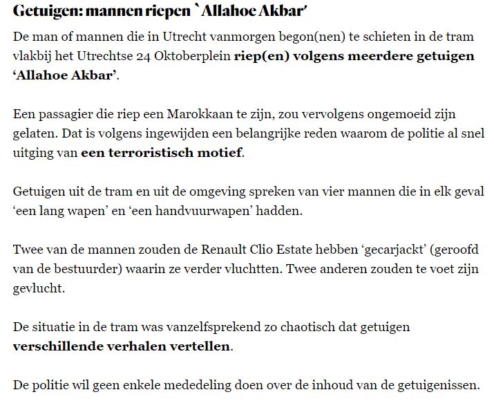 Την είδηση αυτή επιβεβαίωσε και η εφημερίδα Algemeen Dagblad, επικαλούμενη έναν αυτόπτη μάρτυρα, ανέφερε ότι ο ένοπλος στόχευε μια γυναίκα μέσα στο τραμ και κατόπιν πυροβόλησε τους ανθρώπους που προσπάθησαν να την βοηθήσουν.