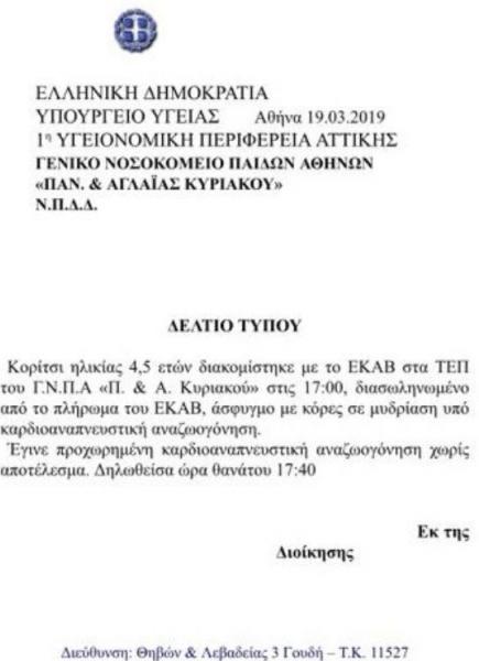 «Κορίτσι ηλικίας 4,5 ετών διακομίστηκε με το ΕΚΑΒ στα ΤΕΠ του Γ.Ν.Π.Α «Π. & Α. Κυριακού» στις 17:00, διασωληνωμένο από το πλήρωμα του ΕΚΑΒ, άσφυγμο με κόρες σε μυδρίαση υπό καρδιοαναπνευστική αναζωογόνηση.
