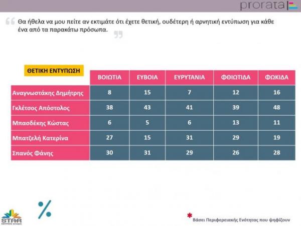 Διαβάζοντας τα ποσοστά των πέντε υποψηφίων που βρίσκονται στις κάρτες (Γκλέτσος, Σπανός, Αναγνωστάκης, Μπατζελή και Μπασδέκης), ο Απόστολος Γκλέτσος έχει μικρό προβάδισμα στους τρεις από τους πέντε νομούς και συγκεκριμένα σε Βοιωτία, Εύβοια και Φθιώτιδα, ενώ αρκετά πιο σημαντικό είναι το προβάδισμα του Φάνη Σπανού στους άλλους δύο και μικρότερους νομούς, Ευρυτανίας και Φωκίδας. Στη Φωκίδα οι αναποφάσιστοι φτάνουν το 35%, δηλαδή περισσότεροι από έναν στους τρεις δεν έχει ακόμη αποφασίσει τι θα ψηφίσει, γεγονός που μπορεί να αλλάξει το τελικό αποτέλεσμα.