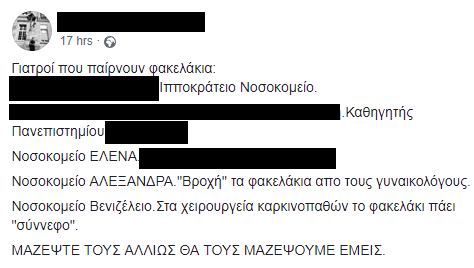 Με δημοσίευσή του στο Facebook, ηγετικό μέλος του «Ρουβίκωνα» κοινοποίησε ονόματα ιατρών που παίρνουν, όπως υποστηρίζει, «φακελάκια».