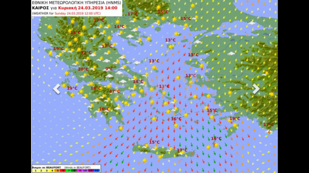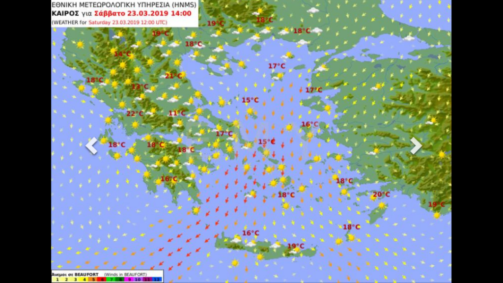 Άνεμοι: βόρειοι βορειοανατολικοί 5 με 6 μποφόρ και στα ανατολικά 7 μποφόρ.