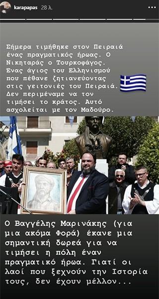 «Σήμερα τιμήθηκε στον Πειραιά ένας πραγματικός ήρωας. Ο Νικηταράς ο Τουρκοφάγος. Ένας άγιος του Ελληνισμού που πέθανε ζητιανεύοντας στις γειτονιές του Πειραιά. Δεν περιμέναμε να τον τιμήσει το κράτος. Αυτό ασχολείται με τον Μαδούρο.