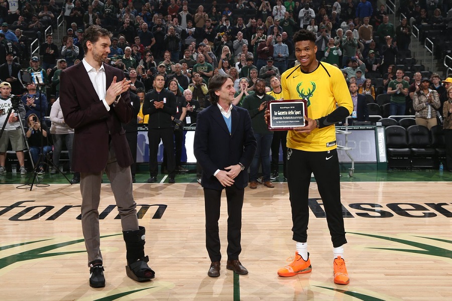 Στο ματς κόντρα στους Χοκς ο Γιάννης Αντετοκούνμπο παρέλαβε το βραβείο του κορυφαίου Ευρωπαίου παίκτη στον κόσμο, από τη «Gazzetta dello Sport».