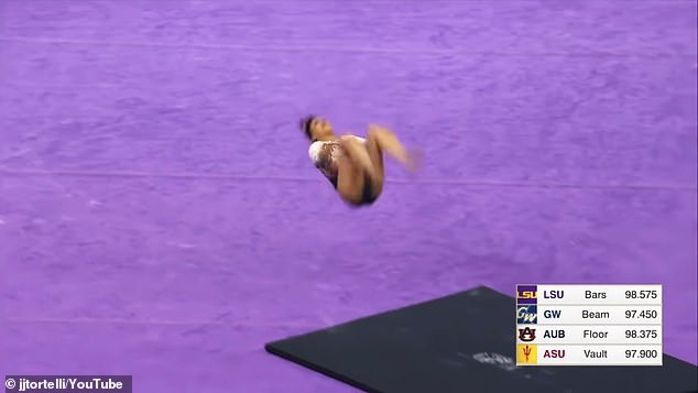 Το κοινό έμεινε με ανοιχτό το στόμα από φρίκη, παρακολουθώντας την νεαρή αθλήτρια από το Πανεπιστήμιο του Όμπερν να τσακίζει και τα δύο της πόδια, εκτελώντας μια απαιτητική φιγούρα, που περιλάμβανε πολλαπλές περιστροφές στον αέρα.