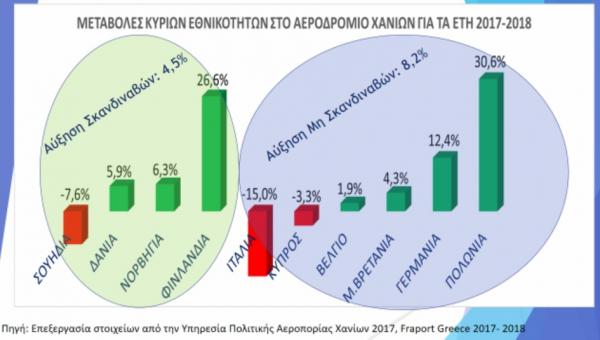 Η αύξηση αυτή παρατηρείται από όλες τις κύριες εθνικότητες που επισκέπτονται τη Δυτική Κρήτη, εκτός των Ιταλών, Σουηδών και Κυπρίων, οι οποίοι μειώνουν τις αφίξεις τους κατά 15%, 8% και 3%, αντίστοιχα. Αντίθετα, τη μεγαλύτερη αύξηση παρουσιάζουν οι Πολωνοί με 31% και Φινλανδοί με 27%, ενώ διψήφιο ποσοστό αύξησης καταγράφουν και οι Γερμανοί με 12%. Στην πρώτη θέση επί των συνολικών αφίξεων παραμένουν οι Σουηδοί παρόλο τη μείωση των αφίξεων τους, ενώ ακολουθούν σε απόσταση αναπνοής Βρετανοί, Νορβηγοί και Δανοί. Επίσης, οι μισοί αλλοδαποί τουρίστες που καταφτάνουν στο αεροδρόμιο Χανίων, προέρχονται από μη Σκανδιναβικές Χώρες, επιβεβαιώνοντας και φέτος τη συνεχή αύξηση αυτών των εθνικοτήτων, οι οποίοι καταφτάνουν στην πλειοψηφία τους με πτήσεις χαμηλού κόστους και κυρίως με την αεροπορική εταιρία Ryanair.