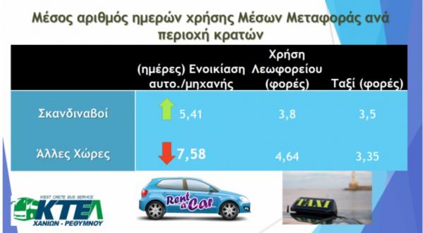 Αναφορικά με τις μετακινήσεις τους, οι αλλοδαποί τουρίστες χρησιμοποιούν κυρίως τα ενοικιαζόμενα αυτοκίνητα με μέσο όρο χρήσης κοντά στις 7 ημέρες, ίδιο αριθμό ημερών σε σχέση με την περυσινή τουριστική περίοδο, ενώ με μεγάλη ικανοποίηση  κάνουν χρήση των λεωφορείων και ταξί για τις διάφορες περιηγήσεις τους. Οι αλλοδαποί επισκέπτες από την Ανατολική Ευρώπη φαίνεται να κάνουν λιγότερο χρήση των ενοικιαζόμενων αυτοκινήτων/μηχανών αλλά και ταξί, λόγω του χαμηλού εισοδήματος.