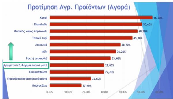 Αναφορικά με την αγορά τοπικών αγροτικών προϊόντων, το κρασί, το ελαιόλαδο, ο φυσικός χυμός πορτοκαλιού και τα τοπικά τυριά συνεχίζουν και φέτος να προτιμώνται περισσότερο από τους αλλοδαπούς τουρίστες, ενώ τα αρωματικά & φαρμακευτικά φυτά συνεχίζουν να καταγράφουν συνεχή ανοδική τάση τα τελευταία έτη.