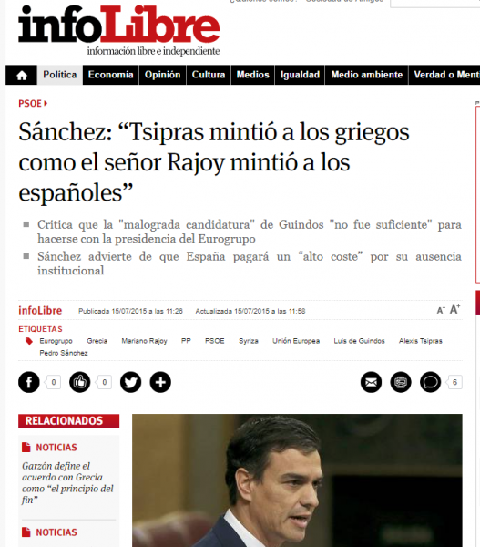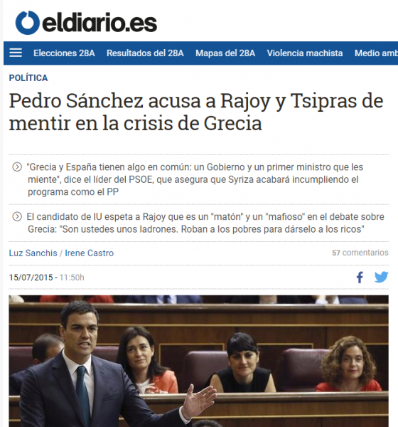 Ήταν μέσα Ιουλίου του 2015, λίγες ημέρες μετά το αλήστου μνήμης δημοψήφισμα και την περίφημη -και διεθνή πια- kolotumba, όταν ο Πέδρο Σάντσεθ από το βήμα του Παλάθιο ντε λας Κόρτες, του ισπανικού κοινοβουλίου επιτέθηκε στον τότε πρωθυπουργό Μαριάνο Ραχόι χαρακτηρίζοντάς τον «τόσο ψεύτη όσο και ο Τσίπρας».