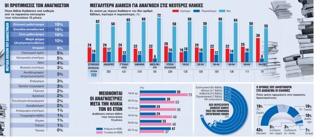 Περίπου οι μισοί Ελληνες (44%) έχουν διαβάσει έστω και ένα βιβλίο τον τελευταίο χρόνο. Από ένα συνολικό πανελλαδικό δείγμα 1.674 ατόμων, αναγνώστες (που διάβασαν έστω ένα βιβλίο τον τελευταίο χρόνο) είναι 723 άτομα. Συστηματικοί αναγνώστες-βιβλιόφιλοι (8 και πάνω βιβλία τον χρόνο) είναι το 13%, μέτριας συχνότητας αναγνώστες (4-7 βιβλία τον χρόνο) το 11% (γυναίκες που μέσα από την ανάγνωση επιλέγουν μια διαδρομή αυτομόρφωσης και αυτοβελτίωσης, λογοτεχνία και χρηστικά βιβλία), ασθενούς συχνότητας αναγνώστες (2-3 βιβλία τον χρόνο) το 10% (νέες γυναίκες που αγαπούν την ελληνική λογοτεχνία) και τέλος περιστασιακής συχνότητας αναγνώστες (1 βιβλίο τον χρόνο) το 11% (μεγαλύτεροι άνδρες που προτιμούν βιβλία ιστορίας, πολιτικής, οικονομίας).