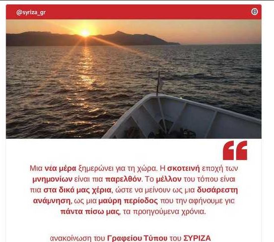 Κι ίσως να μην είναι μόνο μια εντυπωσιακή σύμπτωση ότι στο δελτίο τύπου του ΣΥΡΙΖΑ για το ταξίδι του κ. Τσίπρα στην Ιθάκη για το «τέλος των μνημονίων» συνοδεύεται από φωτογραφία (σχετική φωτογραφία στην ανάρτησή μας) πλώρης σκάφους να προσεγγίζει ένα νησί που φέρεται να είναι η Ιθάκη. Πάντως η εν λόγω φωτογραφία ουδεμία σχέση έχει με την πολυτελή πλώρη της θαλαμηγού Odyssey στην οποία επέβαινε ο πρωθυπουργός.