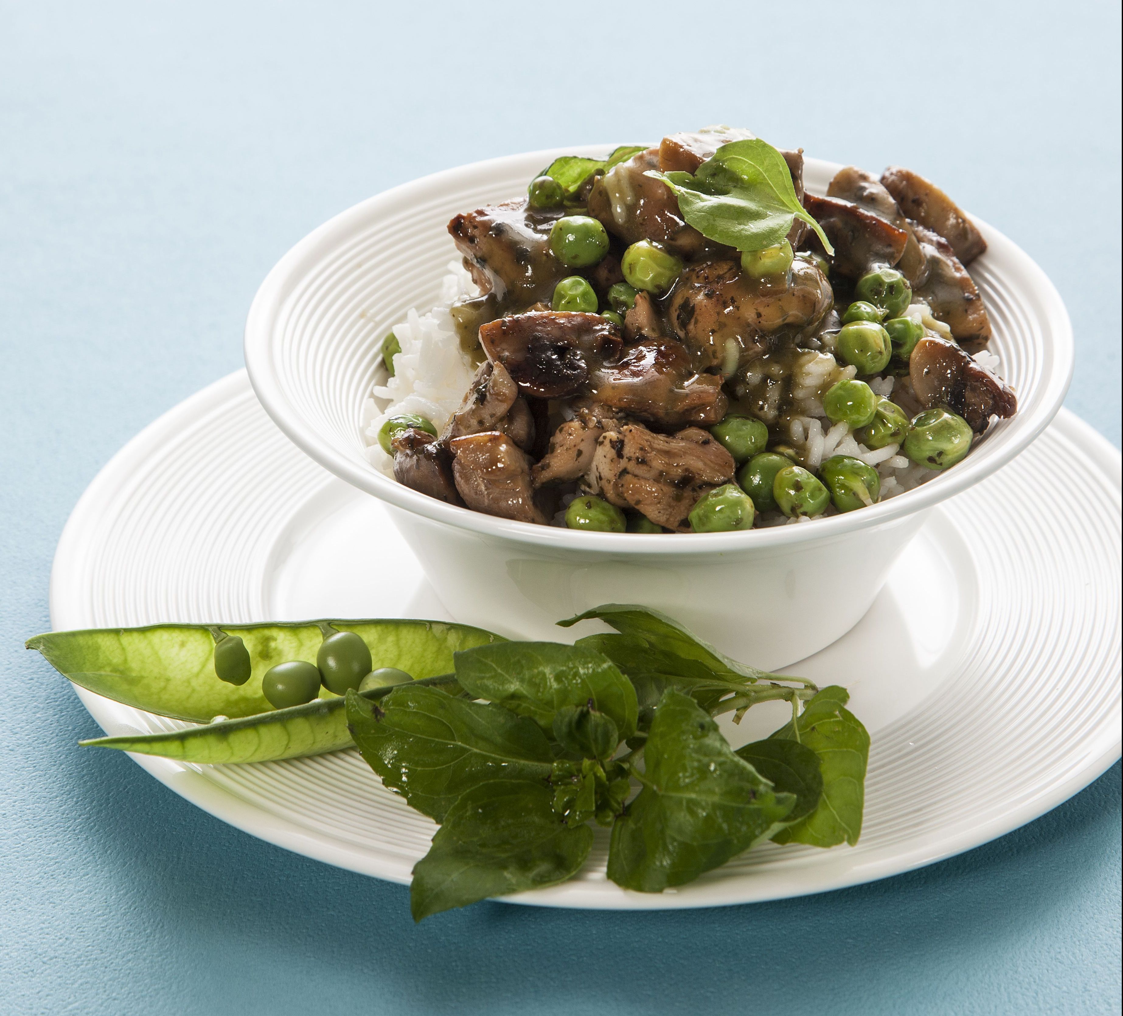 Σε βαθύ τηγάνι, σε μέτρια φωτιά, ρίχνουμε το μισό λάδι και σοτάρουμε τα μανιτάρια μέχρι να μαλακώσουν, για περίπου 5 λεπτά. Τα αφαιρούμε με τρυπητή κουτάλα, προσθέτουμε το υπόλοιπο λάδι και σοτάρουμε το σκόρδο μέχρι να μαλακώσει χωρίς να πάρει χρώμα. Προσθέτουμε το κάρυ. Ανακατεύουμε για περίπου 10 δευτερόλεπτα, προσθέτουμε το γάλα καρύδας και αφήνουμε να πάρει βράση. Προσθέτουμε τη fish sauce, τη ζάχαρη και το κοτόπουλο και αφήνουμε να μαγειρευτεί για περίπου 10 λεπτά. Στο τέλος προσθέτουμε τα μανιτάρια, τον αρακά και το ξύσμα από το λεμόνι. Αφήνουμε στη φωτιά για ακόμη 2-3 λεπτά. Βγάζουμε το σκεύος από τη φωτιά και πασπαλίζουμε το φαγητό με τον βασιλικό. Σερβίρουμε σε μπολ και συνοδεύουμε με ρύζι basmati η jasmine.