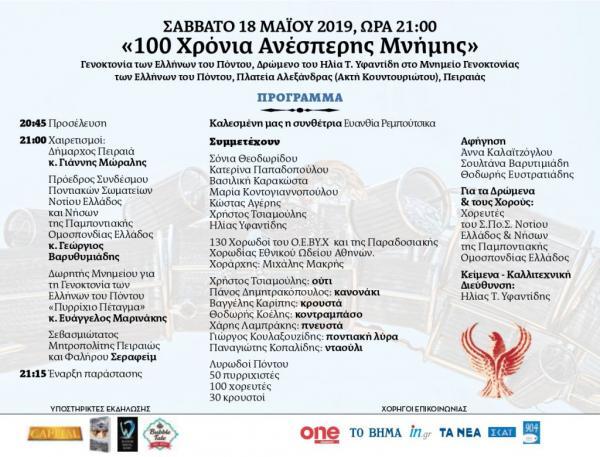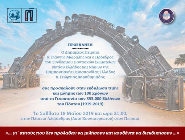 Μια μεγάλη εκδήλωση για την 100 χρόνια από την Γενοκτονία των Ποντίων διοργανώνεται το Σάββατο 18 Μαΐου στην πλατεία Αλεξάνδρας στην Ακτή Κουντουριώτου στον Πειραιά.