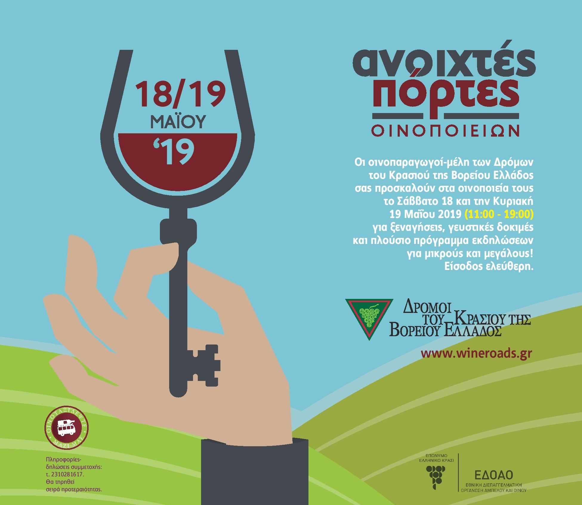 Το Σάββατο 18 και την Κυριακή 19 Μαΐου 2019, από τις 11 το πρωί έως τις 7 το βράδυ, οι οινοπαραγωγοί-μέλη της ένωσης «Οίνοι Βορείου Ελλάδος» και του οινοτουριστικού δικτύου «Δρόμοι του Κρασιού της Βορείου Ελλάδος», προσκαλούν τους φίλους του κρασιού στα επισκέψιμα οινοποιεία τους, για ξεναγήσεις, γευστικές δοκιμές και ένα ιδιαίτερα πλούσιο πρόγραμμα εκδηλώσεων .