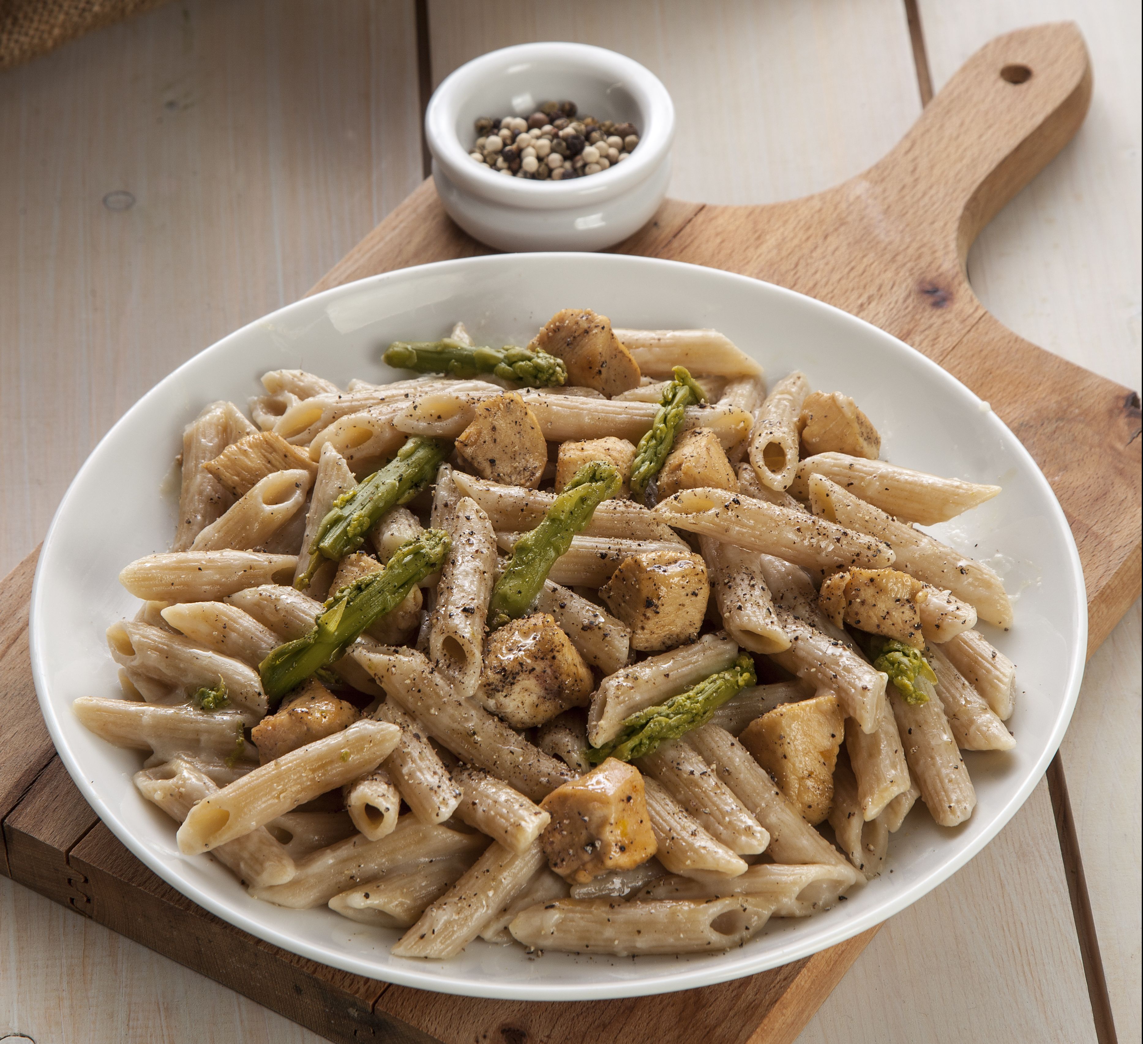 Βράζουμε τα μακαρόνια σε αλατισμένο νερό με βάση τις οδηγίες συσκευασίας. Σουρώνουμε και τα ρίχνουμε στο τηγάνι που ψήσαμε προηγουμένως το κοτόπουλο και τα σπαράγγια.