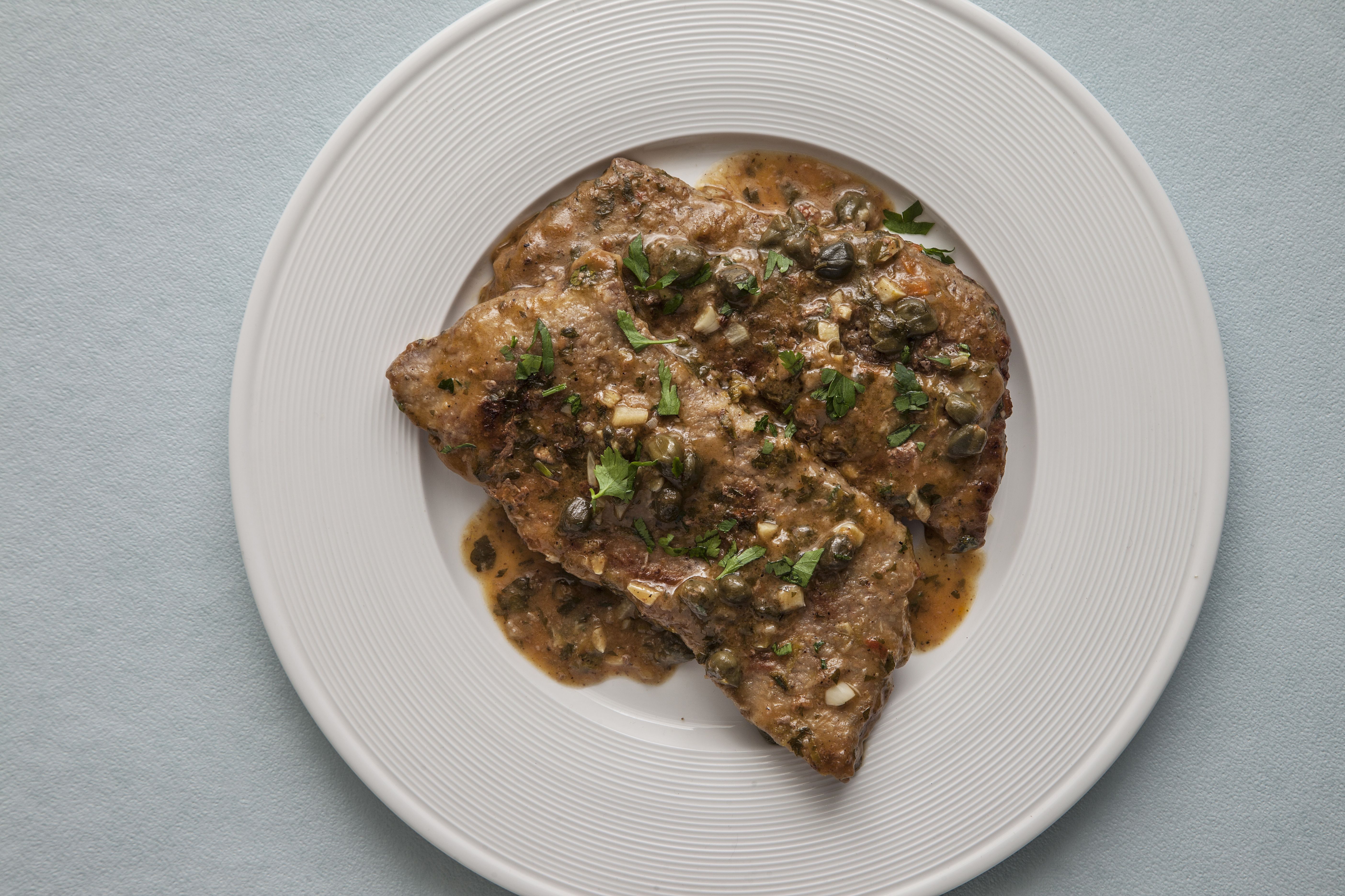 Προσθέτουμε το σκόρδο, την κάπαρη και σβήνουμε με το κρασί. Μόλις εξατμισθεί το αλκοόλ προσθέτουμε τον ζωμό, τον μαϊντανό, το ξύσμα και τον χυμό λεμονιού (ανάλογα με το πόσο όξινο θέλουμε το φαγητό), αλατοπιπερώνουμε και μαγειρεύουμε για περίπου 4-5 λεπτά μέχρι να δέσει η σάλτσα. Σερβίρουμε αμέσως συνοδεύοντας με φρέσκια σαλάτα.