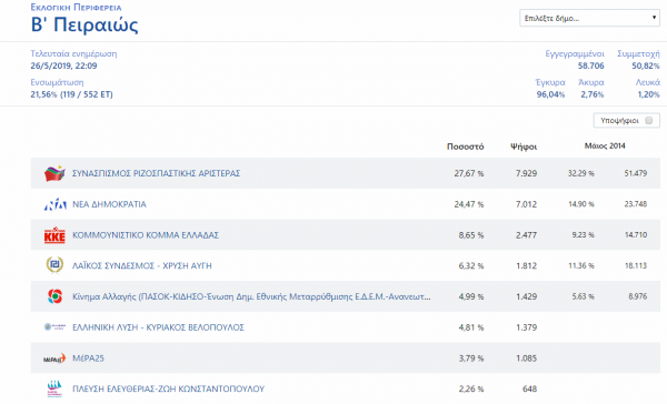 Όσον αφορά την εκλογική περιφέρεια Β΄Πειραιώς και εκεί μέχρι στιγμής μπροστά είναι ο ΣΥΡΙΖΑ με μικρή όμως διαφορά από την Νέα Δημοκρατία.