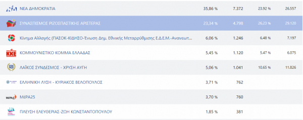 Συγκεκριμένα, η Νέα Δημοκρατία είναι πρώτη στο ποσοστό που δίνει το Υπουργείο Εσωτερικών με 35,79%.