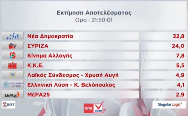 Σύμφωνα με τα μέχρι στιγμής δεδομένα, το κόμμα Ελληνική Λύση του Κυριάκου Βελόπουλου φαίνεται πως εισέρχεται στην Ευρωβουλή ενώ αντίθετα, η εκτίμηση για το ΜεΡΑ του Γιάνη Βαρουφάκη είναι πως δεν θα εκλέξει ευρωβουλευτή.