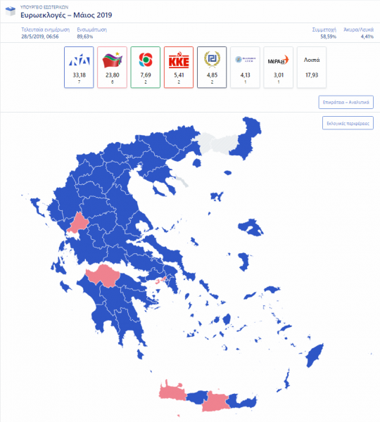 Με την ενσωμάτωση να βρίσκεται στο 89,63% η ΝΔ προηγείται με ποσοστό 33,18% στις ευρωεκλογές, έχοντας διαφορά 9,38 μονάδων από τον ΣΥΡΙΖΑ (23,80%). Ακολουθούν το ΚΙΝΑΛ (7,69%), το ΚΚΕ (5,41%), η Χρυσή Αυγή (4,85%), η Ελληνική Λύση-Βελόπουλος (4,13%) και το ΜέΡΑ25 (3,01%).