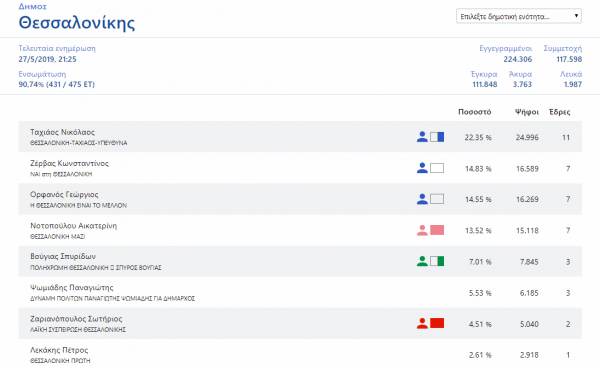 Έχοντας φθάσει στο 90,74% της ενσωμάτωσης μόλις 320 ψήφοι χωρίζουν τον Κώστα Ζέρβα και τον Γιώργο Ορφανό.