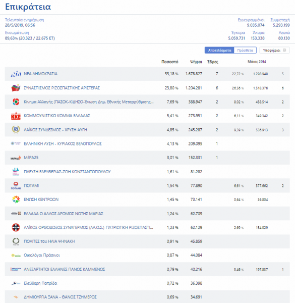 Με την ενσωμάτωση να βρίσκεται στο 89,63% η ΝΔ προηγείται με ποσοστό 33,18% στις ευρωεκλογές, έχοντας διαφορά 9,38 μονάδων από τον ΣΥΡΙΖΑ (23,80%). Ακολουθούν το ΚΙΝΑΛ (7,69%), το ΚΚΕ (5,41%), η Χρυσή Αυγή (4,85%), η Ελληνική Λύση-Βελόπουλος (4,13%) και το ΜέΡΑ25 (3,01%).