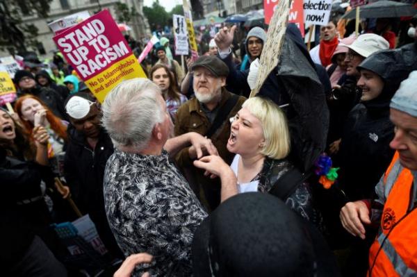 Οι διαδηλωτές φώναζαν συνθήματα, έπαιξαν ντραμς και ανέμιζαν πανό σε ένα «Καρναβάλι Αντίστασης» όπως το χαρακτήρισαν οι διοργανωτές, στην πλατεία Τραφάλγκαρ την ώρα που η πρωθυπουργός παρακαθόταν σε συνομιλίες με τον Τραμπ σε κοντινή απόσταση, στην κατοικία της στην Ντάουνινγκ Στριτ.