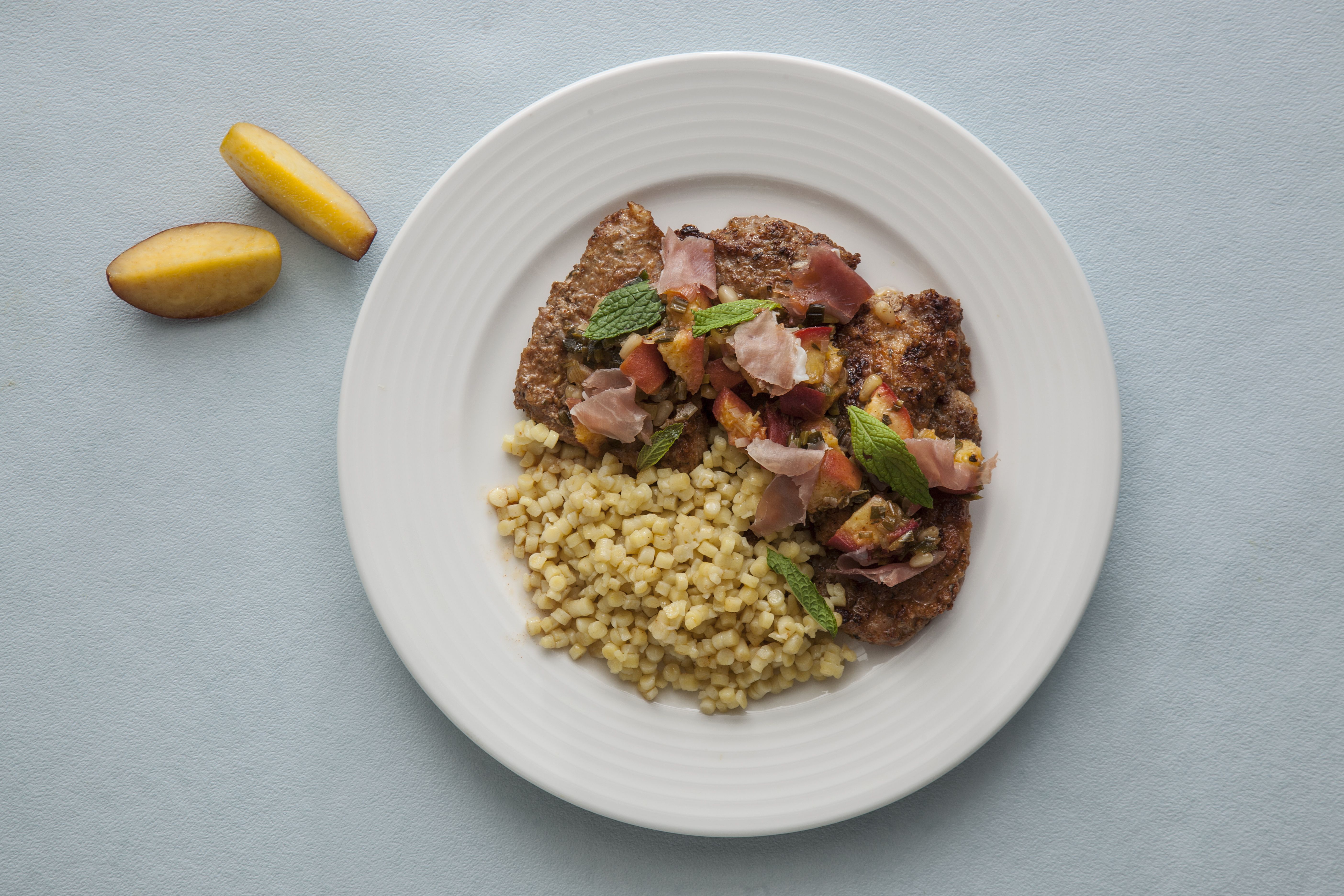 Σερβίρισμα: Σε κάθε πιάτο σερβίρουμε πρώτα το κουσκουσάκι ή το ρύζι, βάζουμε από πάνω το εσκαλόπ με τη σάλτσα ροδάκινου και πασπαλίζουμε με ψιλοκομμένο δυόσμο και τα κομματάκια προσούτο (προαιρετικά).
