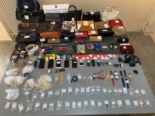 Στην κατοχή τους και μετά από έρευνες σε οικίες και χώρους βρέθηκαν και κατασχέθηκαν πλήθος από ρολόγια χειρός, κοσμήματα, γυναικείες τσάντες, κινητά τηλέφωνα και κάρτες sim , δύο σπρέι πιπεριού, διαρρηκτικά εργαλεία, το χρηματικό ποσό των 700 ευρώ, καθώς και τα δύο 2 «επιχειρησιακά» αυτοκίνητα που χρησιμοποιούσαν για την εγκληματική τους δράση.
