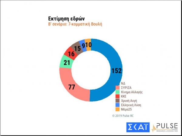 2. Στο δεύτερο σενάριο με 7κομματική βουλή η ΝΔ παίρνει 152 έδρες, οριακή πλειοψηφία, ο ΣΥΡΙΖΑ 77 και το ΚΙΝΑΛ 21 έδρες.
