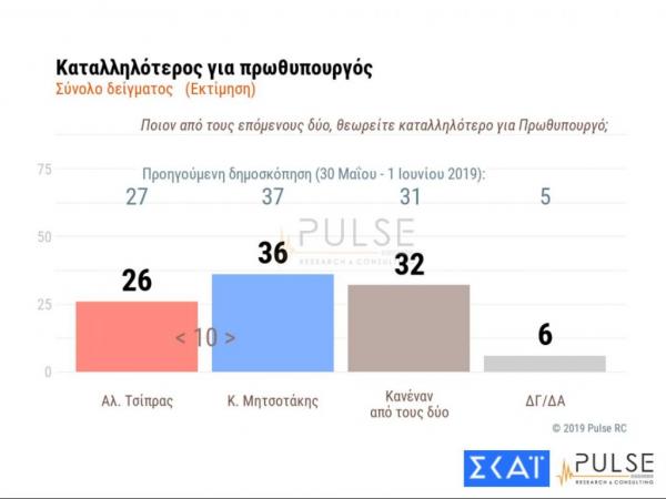 Καταλληλότερος για πρωθυπουργός εμφανίζεται ο Κ. Μητσοτάκης με 36% έναντι 26% του Αλέξη Τσίπρα ενώ το 32% λέει κανείς από τους δύο.
