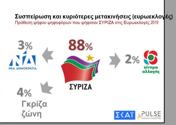 Στο 88% έχει φτάσει η συσπείρωση του ΣΥΡΙΖΑ με απώλειες 2% στο ΚΙΝΑΛ, 3% στη ΝΔ και 4% στην γκρίζα ζώνη.