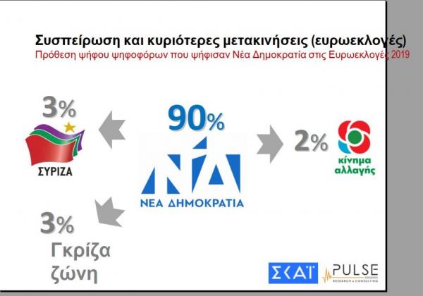 Τεράστια είναι η συσπείρωση της ΝΔ (ψηφοφόροι που ψήφισαν ΝΔ στις ευρωεκλογές), στο 90% και φεύγουν ψηφοφόροι της σε ποσοστό 3% προς τον ΣΥΡΙΖΑ, 3% σε γκρίζα ζώνη, 2% στο ΚΙΝΑΛ.