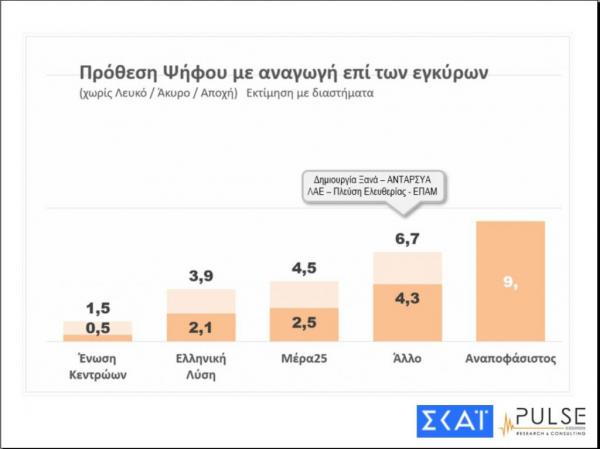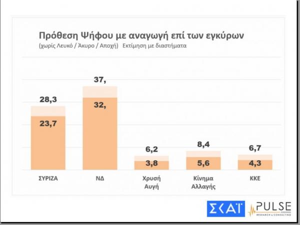 Πάντως, η Pulse δίνει κι ένα ακόμη στοιχείο ως προς την πρόθεση ψήφου με αναγωγή επί των εγκύρων (χωρίς λευκό, άκυρο, αποχή). Η ΝΔ παίρνει ποσοστό από 32 έως 37%, ο ΣΥΡΙΖΑ από 23,7% έως 28,3% που φαίνεται να είναι το ταβάνι, η Χρυσή Αυγή από 3,8% έως 6,2%, το ΚΙΝΑΛ από 5,6% έως 8,4% και το ΚΚΕ από 4,3% έως 6,7%.
