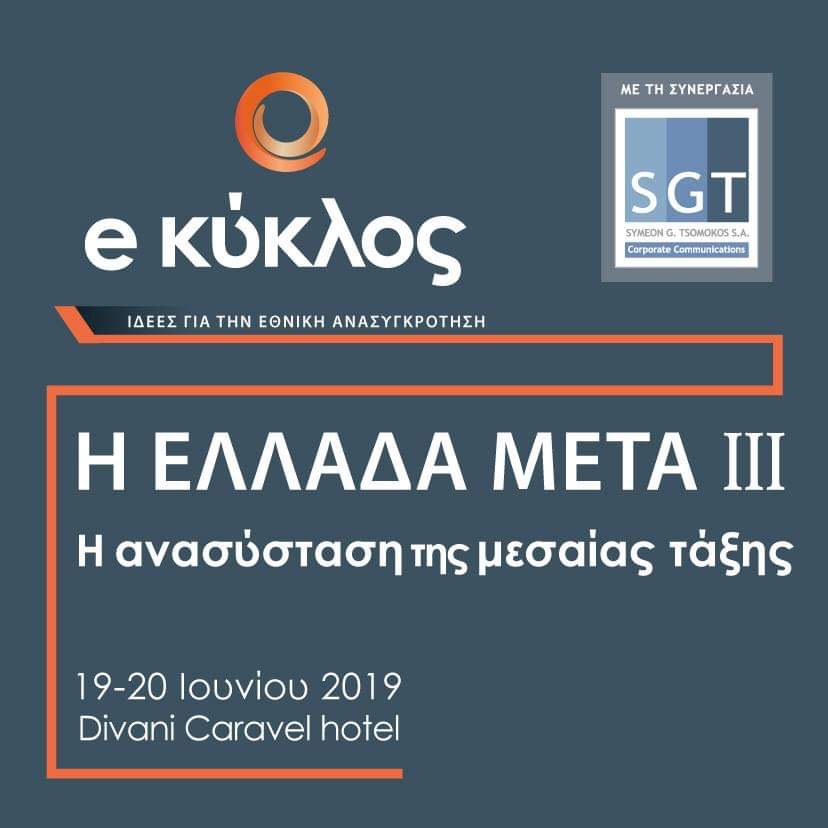 Για τρίτη συνεχή χρονιά ο Κύκλος ιδεών για την Εθνική Ανασυγκρότηση, σε συνεργασία με τη Συμεών Γ. Τσομώκος Α.Ε., πραγματοποιούν το ετήσιο διήμερο συνέδριο H ΕΛΛΑΔΑ ΜΕΤΑ, στις 19 και 20 Ιουνίου 2019, στο ξενοδοχείο Divani Caravel. Κεντρικό θέμα στο φετινό συνέδριο είναι η ανασύσταση της μεσαίας τάξης.