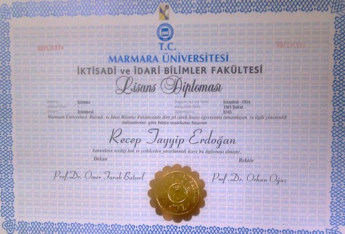 Σημειώνεται ότι η φωτοτυπία του πανεπιστημιακού τίτλου που υπέβαλε ο Ερντογάν στην Ανώτατη Εφορευτική Επιτροπή, για να του επιτραπεί να συμμετάσχει ως υποψήφιος στις προεδρικές εκλογές, λέει ότι ο Ερντογάν αποφοίτησε τον Φεβρουάριο του 1981 από το Πανεπιστήμιο του Μαρμαρά, το οποίο όμως ιδρύθηκε τo 1982 ή για την ακρίβεια πήρε αυτήν την ονομασία και αναγνωρίστηκε ως ανώτατο εκπαιδευτικό ίδρυμα, ως μετεξέλιξη της Ακαδημίας Οικονομικών και Εμπορικών Επιστημών, σύμφωνα με τη σελίδα του Πανεπιστημίου: