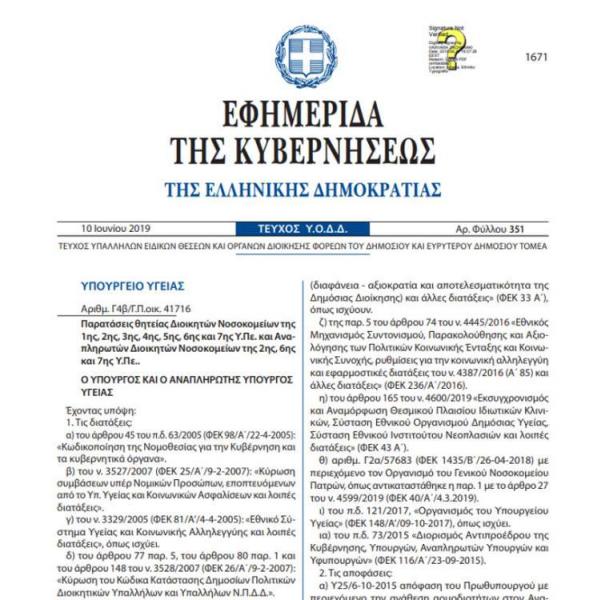 Το ΦΕΚ της υπουργικής απόφασης για παράταση της θητείας των διοικητών των Νοσοκομείων