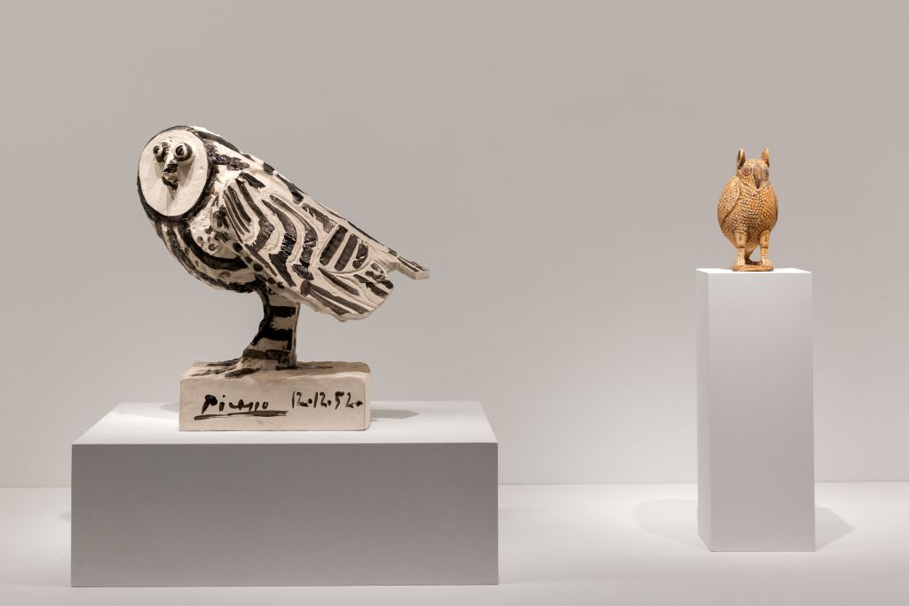 Για πρώτη φορά 68 σπάνια κεραμικά και σχέδια του Πικάσο με πτηνά,τετράποδα και θαλάσσια όντα, ανθρώπινες μορφές, μυθολογικά ή μειξογενή όντα (Κένταυρος-Μινώταυρος) και άλλα έργα εμπνευσμένα από αρχαίες τραγωδίες και κωμωδίες, «συνομιλούν» θεματικά με 67 αρχαιότητες, δημιουργώντας έναν ακόμη «Θεϊκό Διάλογο» μεταξύ της αρχαίας ελληνικής και της μοντέρνας τέχνης.
