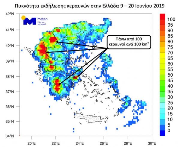 Στις περισσότερες περιοχές της ηπειρωτικής Ελλάδας ο μήνας με την εντονότερη κεραυνική δραστηριότητα είναι ο Ιούνιος. Παρόλο που η κεραυνική δραστηριότητα μέσα στο διάστημα των 12 τελευταίων ημερών (9-20 Ιουνίου 2019) ήταν αυξημένη, καθώς καταγράφηκαν στη χώρα περίπου 96.200 κεραυνοί, δεν επρόκειτο για κάτι πρωτόγνωρο.