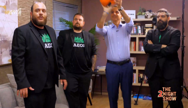 Νωρίτερα, ο πρόεδρος της ΝΔ είχε υποβληθεί στην γνωστή ανάκριση από τις «Μύγες» (Φάνης Λαμπρόπουλος, Θανάσης Πασσάς, Νίκος Ράπτης), η οποία κατέληξε σε μπασκετική δοκιμασία. Ο Κυριάκος Μητσοτάκης πέτυχε 2 στις 3 βολές.