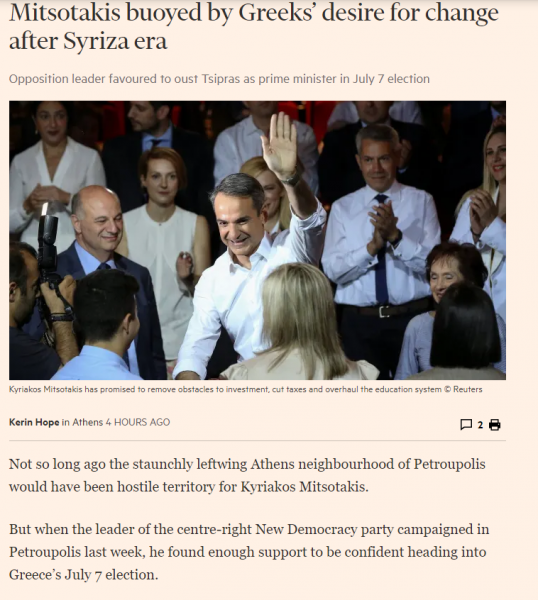Στο ρεπορτάζ των FT γίνεται και αναφορά στις δημοσκοπήσεις που δίνουν αυτοδυναμία στη ΝΔ με 154 έως 164 έδρες στην επόμενη Βουλή, έναν αριθμό που εξαρτάται στο πόσα μικρά κόμματα θα μείνουν εκτός κοινοβουλίου.