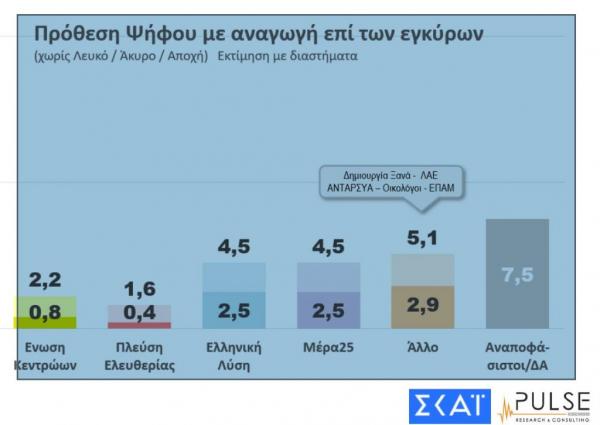 Όμως, στην πρόθεση ψήφου με αναγωγή επί των εγκύρων (μέσες τιμές διαστήματος) η ΝΔ παίρνει ποσοστό 36%, ο ΣΥΡΙΖΑ 27, δηλαδή διαφορά 9 μονάδων. Το ΚΙΝΑΛ ανεβαίνει στο 7%, χαμηλότερα από το ποσοστό που πήρε στις ευρωεκλογές, το ΚΚΕ 5%, η Χρυσή Αυγή 4% και πάλι Βελόπουλος και Βαρουφάκης περνούν το όριο του 3% και μπαίνουν στη Βουλή.