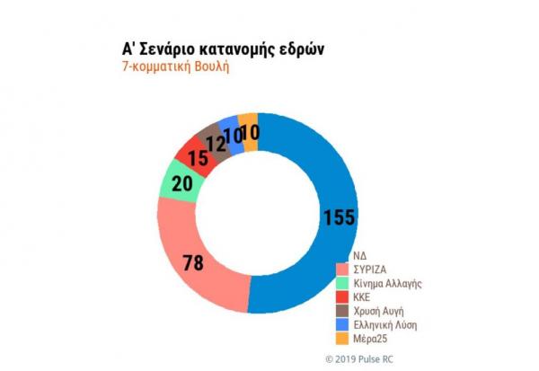 Με 7κομματική Βουλή η ΝΔ παίρνει 155 βουλευτές, ο ΣΥΡΙΖΑ 78 βουλευτές, 20 το ΚΙΝΑΛ, 15 το ΚΚΕ, 12 η Χρυσή Αυγή και από 10 ο Βελόπουλος και ο Βαρουφάκης.