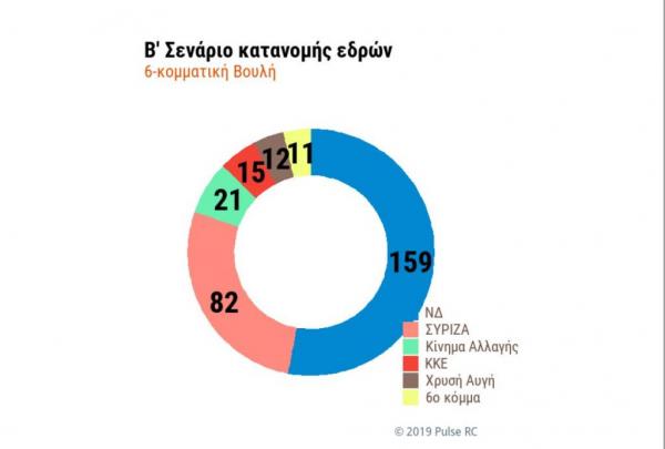 Στο δεύτερο σενάριο με 6κομματική Βουλή η ΝΔ παίρνει 159 βουλευτές, ο ΣΥΡΙΖΑ 82 βουλευτές, 21 το ΚΙΝΑΛ, 15 το ΚΚΕ, 12, η Χρυσή Αυγή και 11 το έκτο κόμμα (Ελληνική Λύση ή Μέρα 25).