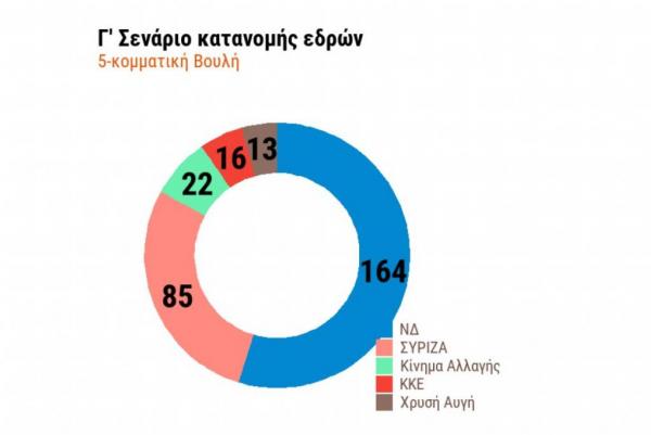 Στο τρίτο σενάριο με 5κομματική βουλή η ΝΔ παίρνει 164 βουλευτές, ο ΣΥΡΙΖΑ 85 βουλευτές, 22 το ΚΙΝΑΛ, 16 το ΚΚΕ, 13 η Χρυσή Αυγή.