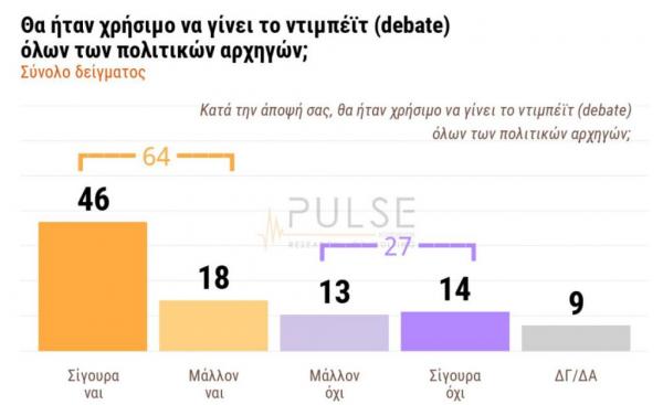 Τέλος, το 64% λέει ότι θα ήταν σίγουρα ή μάλλον ναι χρήσιμο ένα ντιμπέιτ όλων των πολιτικών αρχηγών.