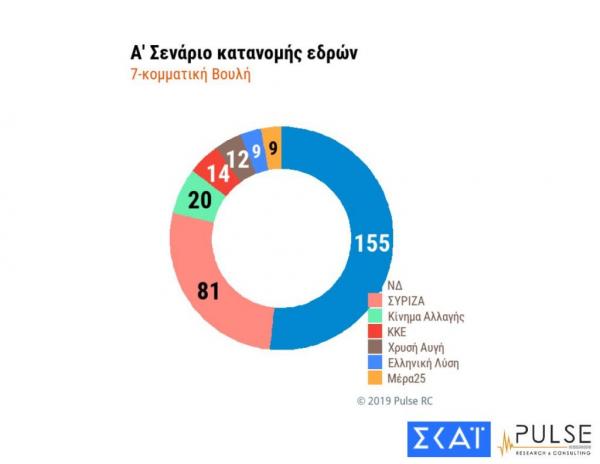 Με 7-κομματική Βουλή και τα παραπάνω ποσοστά η ΝΔ παίρνει 155 έδρες, ο ΣΥΡΙΖΑ 81 έδρες, το ΚΙΝΑΛ 20 έδρες, 14 το ΚΚΕ, 12 η Χρυσή Αυγή και από 9 Μέρα 25 και Ελληνική Λύση.