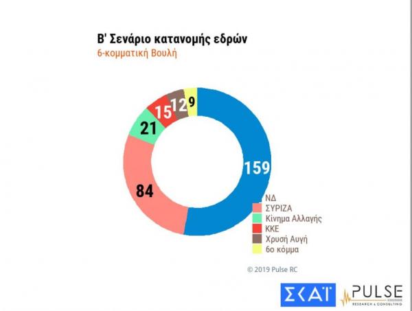 Στο σενάριο της 6-κομματικής Βουλής ο Κ. Μητσοτάκης θα έχει 159 έδρες, ο Τσίπρας 84 έδρες, 21 το ΚΙΝΑΛ, 15 το ΚΚΕ< 12 η Χρυσή Αυγή και 9 το κόμμα που θα μπει στη Βουλή.