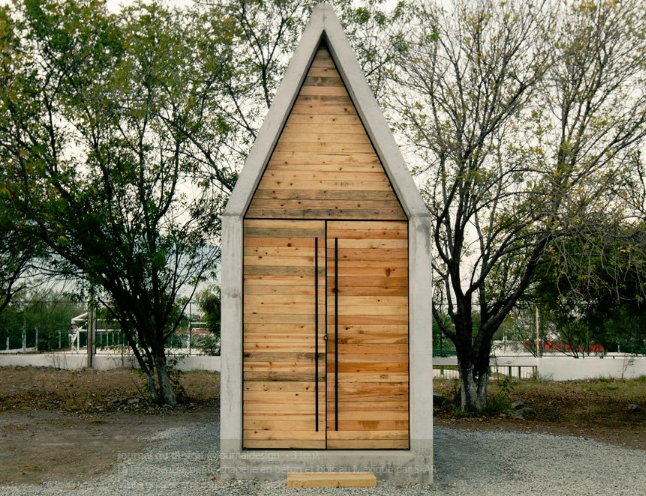 Μία απότομη οροφή καλύπτει αυτό το μικρό εκκλησάκι από τσιμέντο και ξύλο, που έχει κατασκευάσει το μεξικάνικο αρχιτεκτονικό γραφείο S-AR στο Μοντερέι.