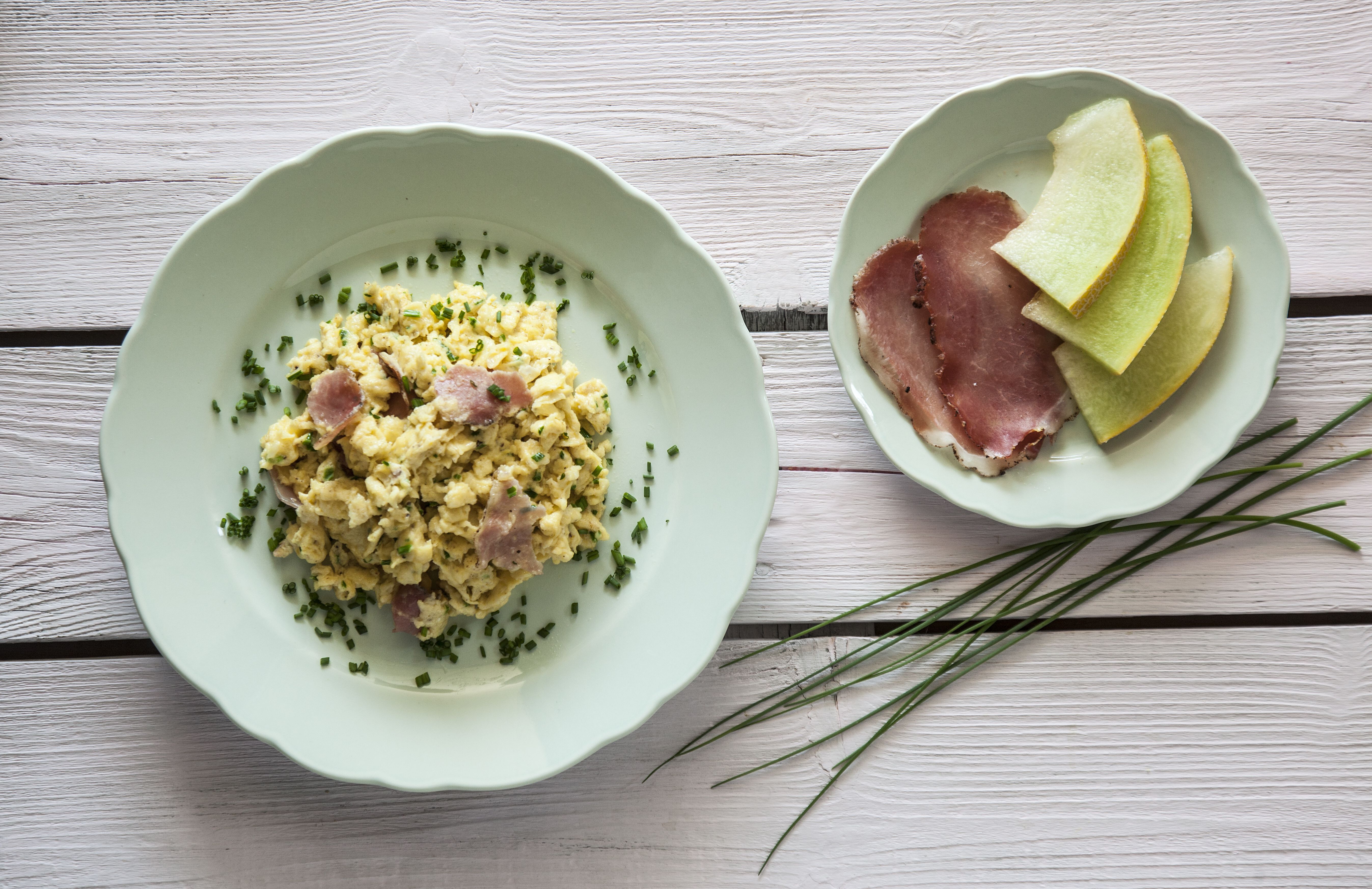 Σε ένα μπολ, σπάμε τα αβγά και τα χτυπάμε με την κρέμα γάλακτος. Προσθέτουμε το τυρί, τη λούζα και το μισό σχοινόπρασο και ανακατεύουμε.