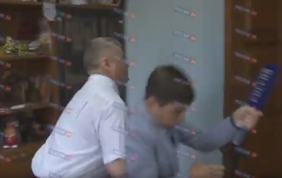 To περιστατικό κατέγραψε με την κάμερά του καμεραμάν του Russia24 Νews κατά τη διάρκεια της συνέντευξης με τον επικεφαλής της περιφέρειας Σιρίνσκι της Ρωσικής Δημοκρατίας της Χακασίας Σεργκέι Ζάιτσεφ.